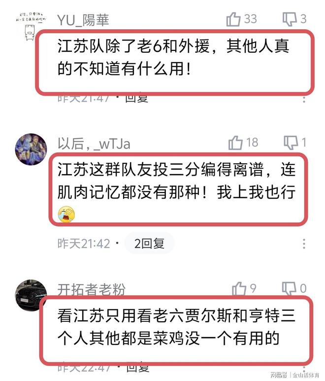“老六”都爆成这样了,依然换不来一场胜广东,赛后网友纷纷表示。“庞峥麟是真厉害,队友是真不太给力。最后同曦也够给机会了,4罚0中,可惜江苏没把握住,太可惜!”;“江苏队除了老6和外援,其他人真的不知道有什么用!”;“江苏这群队友投三分编得离谱,连肌肉记忆都没有那种!我上我也行。”;“看江苏只用看老六贾尔斯和亨特三个人其他都是菜鸡没一个有用的”;“老六啊,这帮队友太不给力了,下赛季赶紧换个球队吧”……